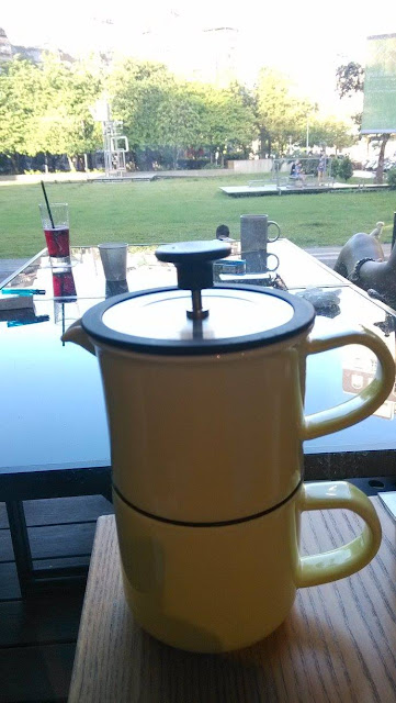 在外頭熾熱的天氣,咖啡館的玻璃好像一面大鏡子,裡頭的冷氣超涼爽,一進去跟外頭比較簡直是兩個世界。白天的的客人不多,我很難想像這樣的咖啡館可以存活,可是坐了幾個小時觀察的結果,車道賣咖啡的服務沒有停過,很多人開車過來買咖啡,白天店裡雖然沒有坐滿,可是悠閒的阿拉伯男人會進來喝杯咖啡,看一下報紙,然後又很悠閒很輕飄飄的離開。