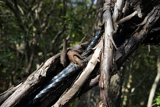 四國山裡面有許多妖怪傳說,或者是瀨戶內海的女木島被稱為鬼島,到了四國村的第一站,就是右下圖這個藤製的吊橋,不過四國村這個是鋼纜外面包覆著藤繩,看起來好像是真的。