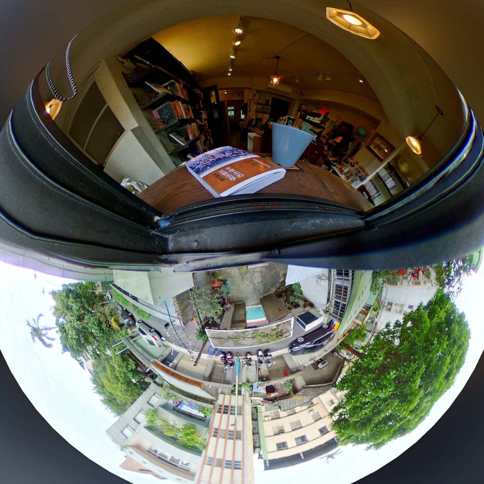 陽光照射在一樓的門樑上的青苔,冷氣掛在各式各樣建築的外面,這家書店往外望,至少看了這個巷道八十幾年的變化。