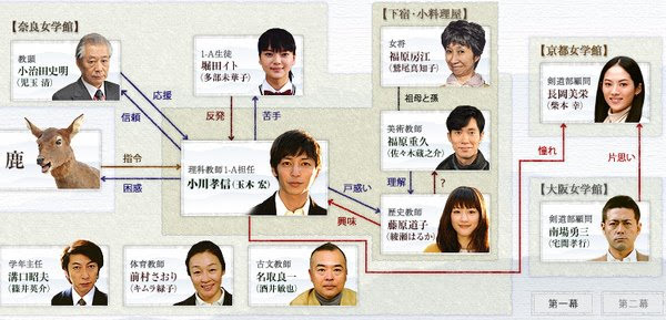 簡單的來說在平城京(奈良)的前任京城是藤原京,剛好是電視劇中的女主角藤原老師,不過萬城目學的小說藤原老師是男的。平城京後來遷都到長岡京,狐狸的使者是長岡老師,而狐狸又是稻荷神社的使者,總社在京都的伏見,這樣的對照關係讓人事物連結了起來。