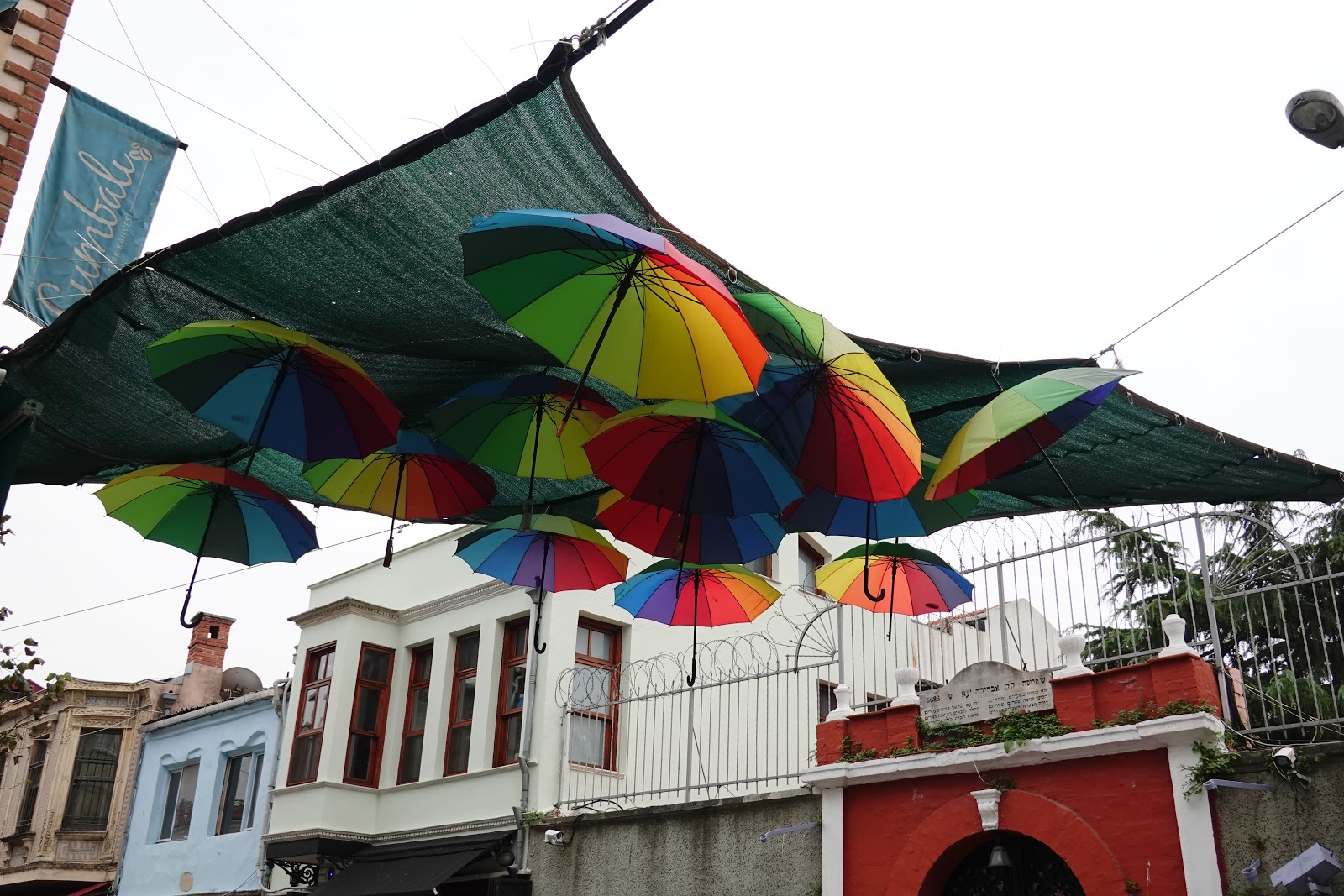 猶太教堂的門口布置彩虹傘,應該是整個商業區的共同風格,不過教堂門口布置成這樣,教友會不會非常尷尬?