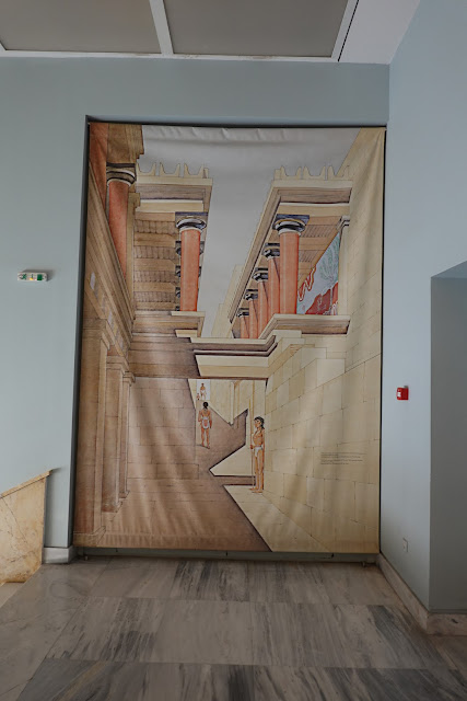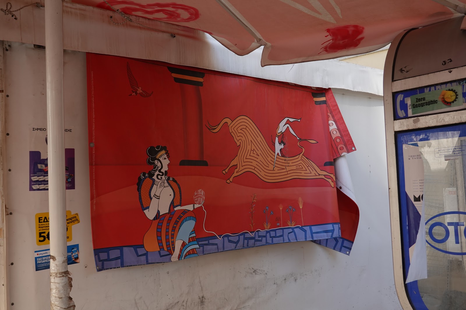 這是博物館外的一個圖案,說明克諾索斯的希臘神話傳說:國王米諾斯的太太與公牛私生了牛首人身的怪物、後來特修斯進入迷宮殺了牛怪,帶了美麗的公主逃出來。