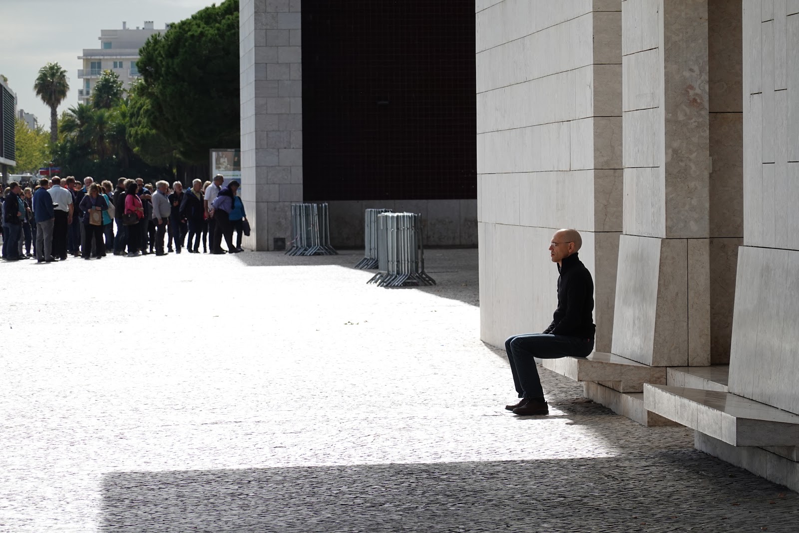 陽光/遮陽,排隊/個人,現代建築卻偽裝成石塊的建築