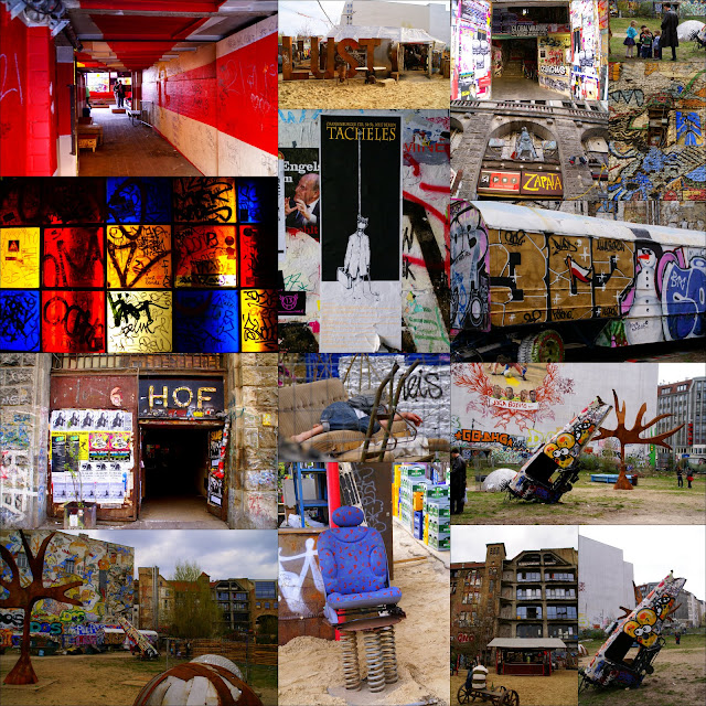 環伺周圍,塗鴉的色彩豐富度實在驚人,但是在斷岩殘壁裡彷彿又透出一點往日的華麗氣氛,但回想東柏林冷峻氣氛的電影,又對這一切感到詭譎。這一切廢墟式的景觀隨著夜的來臨,燈光打在牆上,又變了另一種景象,周邊有些餐廳開始營業,人潮浮現,一些人拿著啤酒瓶大聲的聊天,我看著樓上奇裝異服的龐克,在這藝術中心似乎我才是少數的異類。