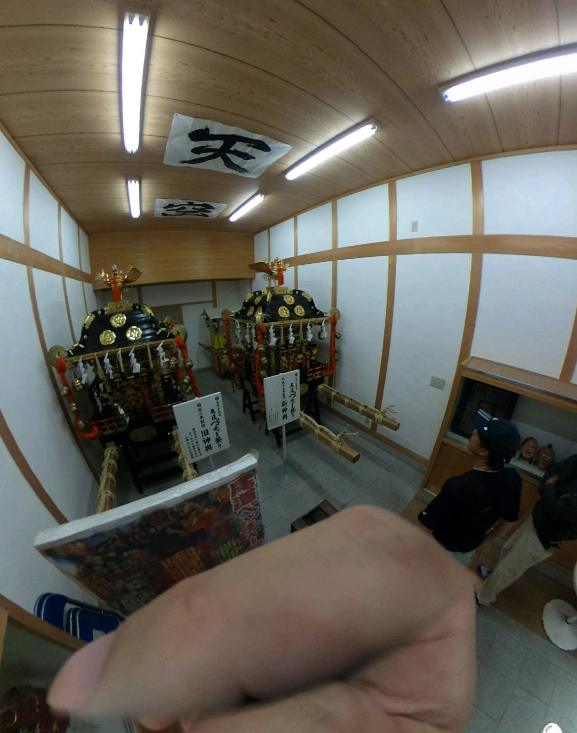 我提早到了御袖天滿宮等待,用全景相機到處自拍,周邊拿著大單眼的歐吉桑看著我非常好奇那台小東西,於是我展示了一下,詢問了一下何時才會有神轎衝上這神社,原來還要等待兩個多小時,看到這些歐吉桑拿著腳架,並且全副武裝帶很多鏡頭有備而來,而我到處找不到拍照的好位置,還想把全景相機掛在樹上,或是放到神社前,用手機遙控,這樣的視角應該是最好的吧?